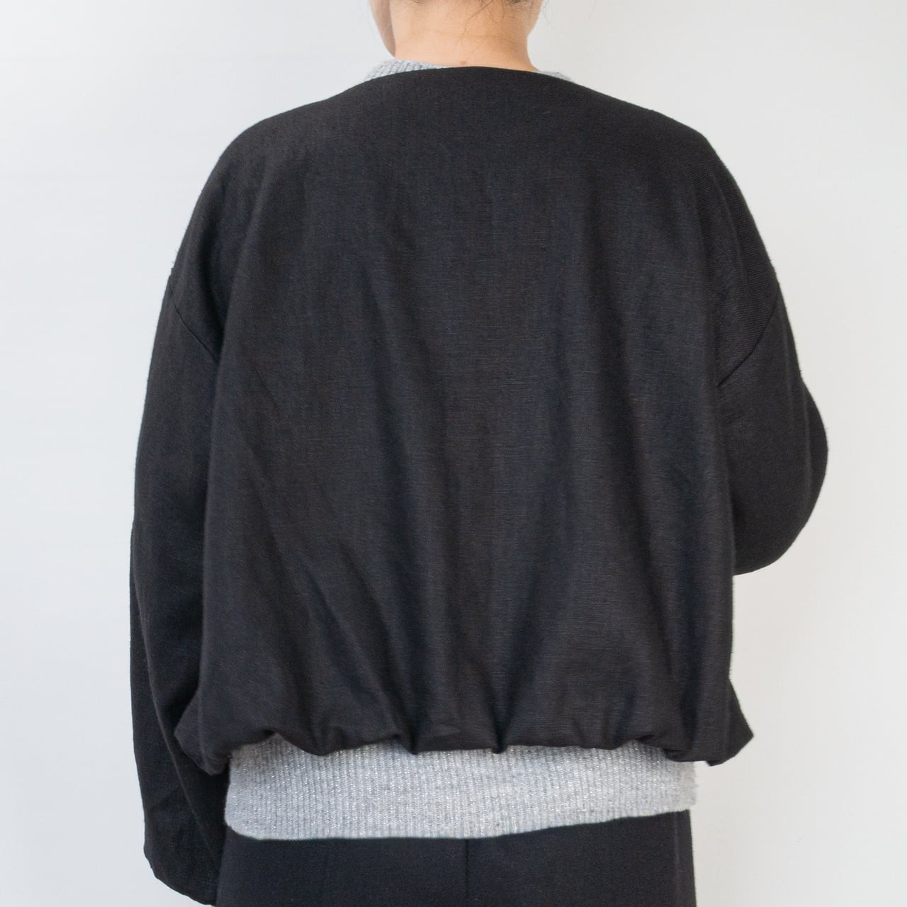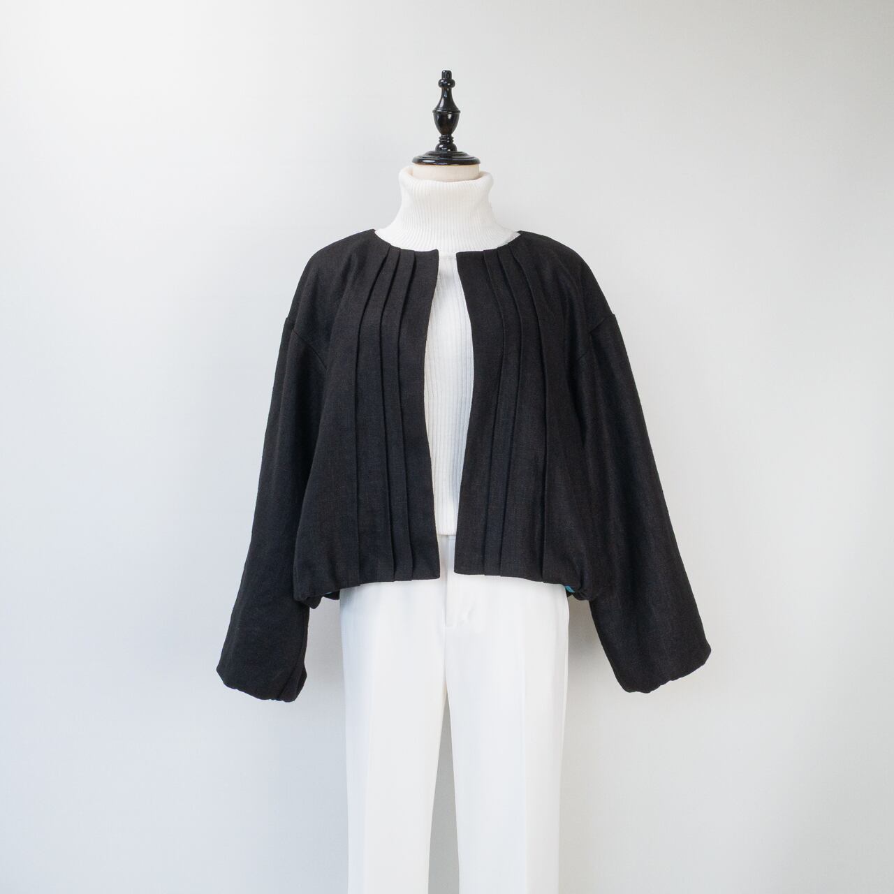印象に残るノーカラージャケット【ラミーリネン・黒×ターコイズ・ストライプ・水玉】