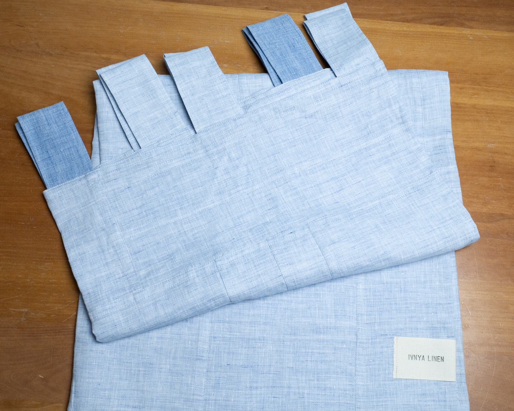 上質な手触りのよい国産リネンを、ひと手間かけて丁寧に折りふせ縫いでつなぎ合わせているので、裏から見てもきれいな仕上がりです。