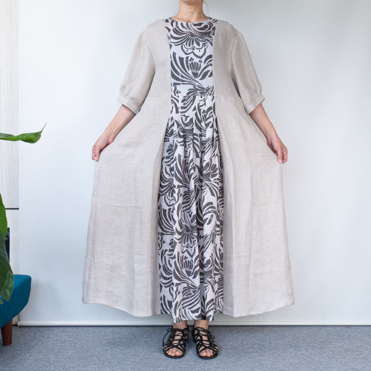 リネンガーゼのシックなサマードレス【グレージュ×グレー花柄・マキシ丈・ドロップショルダー】