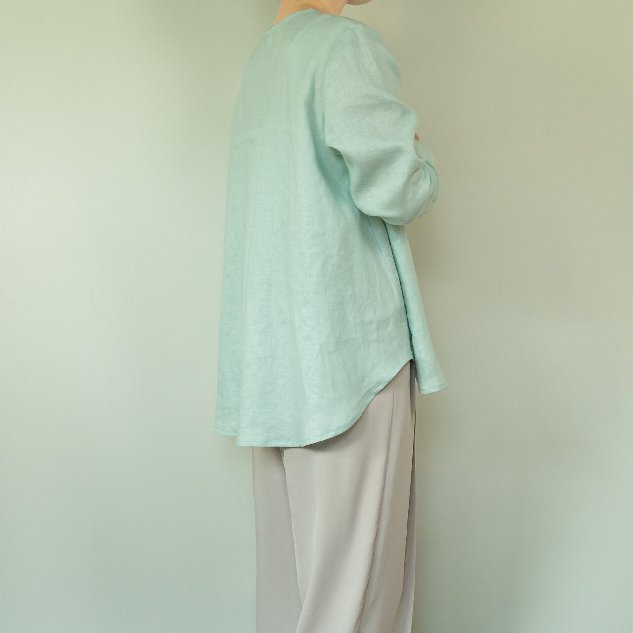 前立てに添えられたポップなビーズのきらめきが目を引く、一枚で決まる軽やかハッピーなリネンシャツ