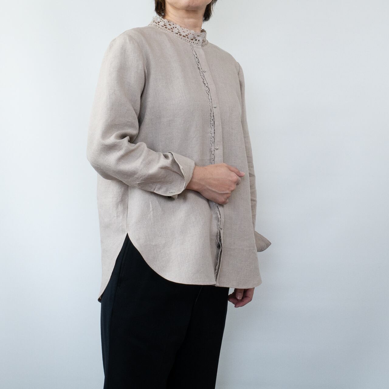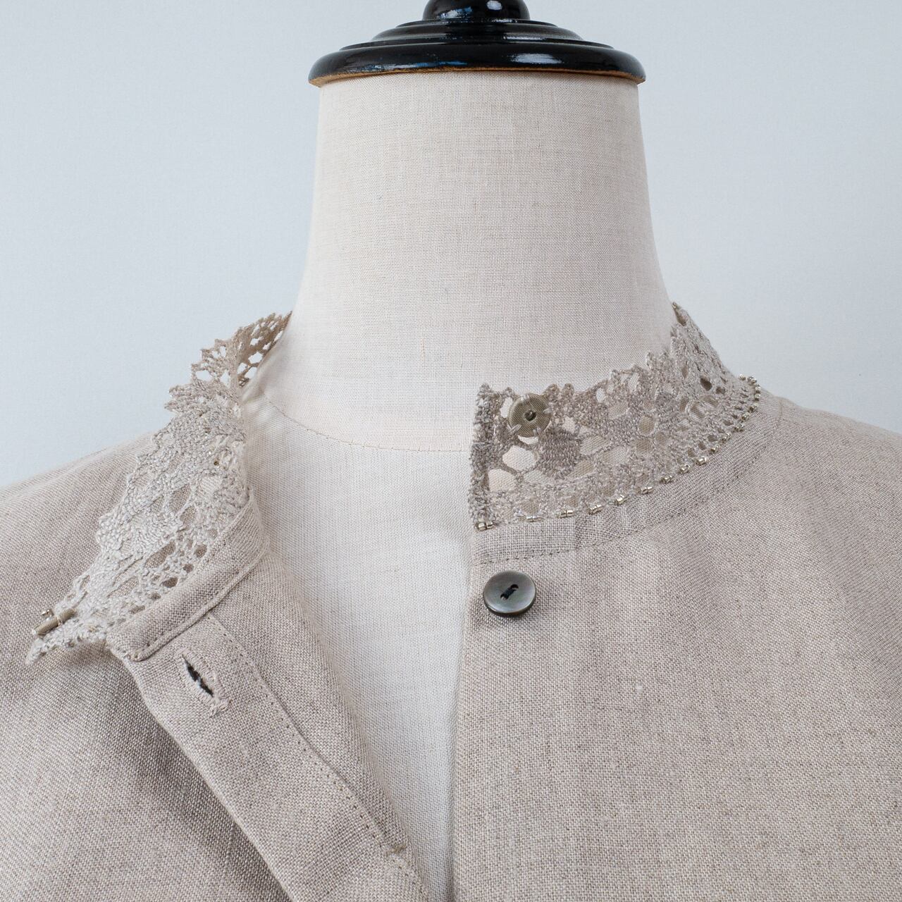 ・首のラインにきれいに沿ったリネンレースのスタンドカラー